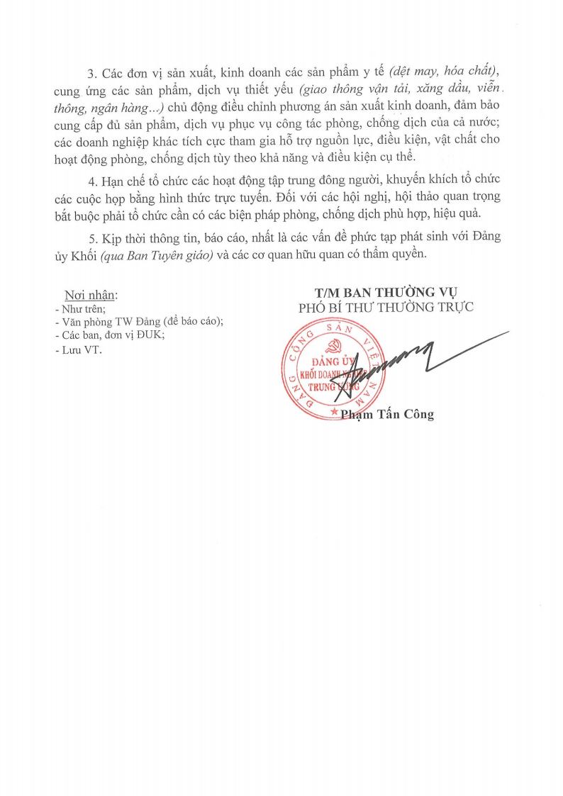 Theo Công văn, Ban Thường vụ Đảng ủy Khối yêu cầu các đảng ủy trực thuộc tăng cường công tác lãnh đạo, chỉ đạo tập trung, thống nhất công tác phòng, chống dịch tại doanh nghiệp; ý thức việc "chống dịch như chống giặc", quyết tâm kiểm soát, không để dịch lây lan, góp phần đảm bảo phát triển kinh tế, xã hội, trật tự, an toàn xã hội, ổn định đời sống nhân dân và tổ chức đại hội đảng bộ các cấp thành công.