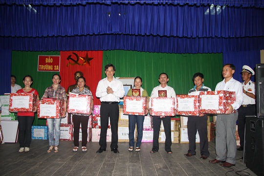 | Đồng chí Trần Thanh Khê-Ủy viên Ban TV, Trưởng ban Tuyên giáo ĐUK, Phó trưởng đoàn đại biểu Đảng bộ Khối, thăm tặng quà các cháu thiếu nhi Đảo Sinh Tồn |