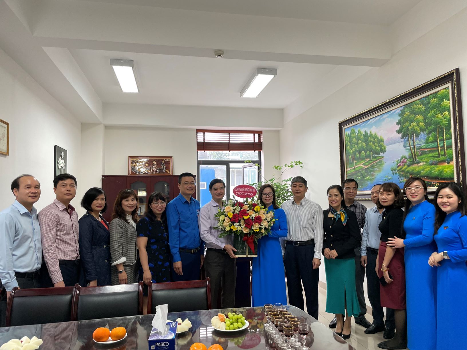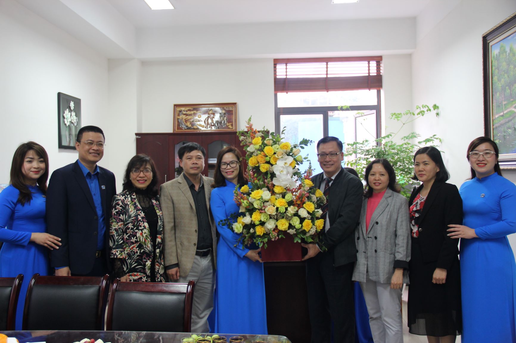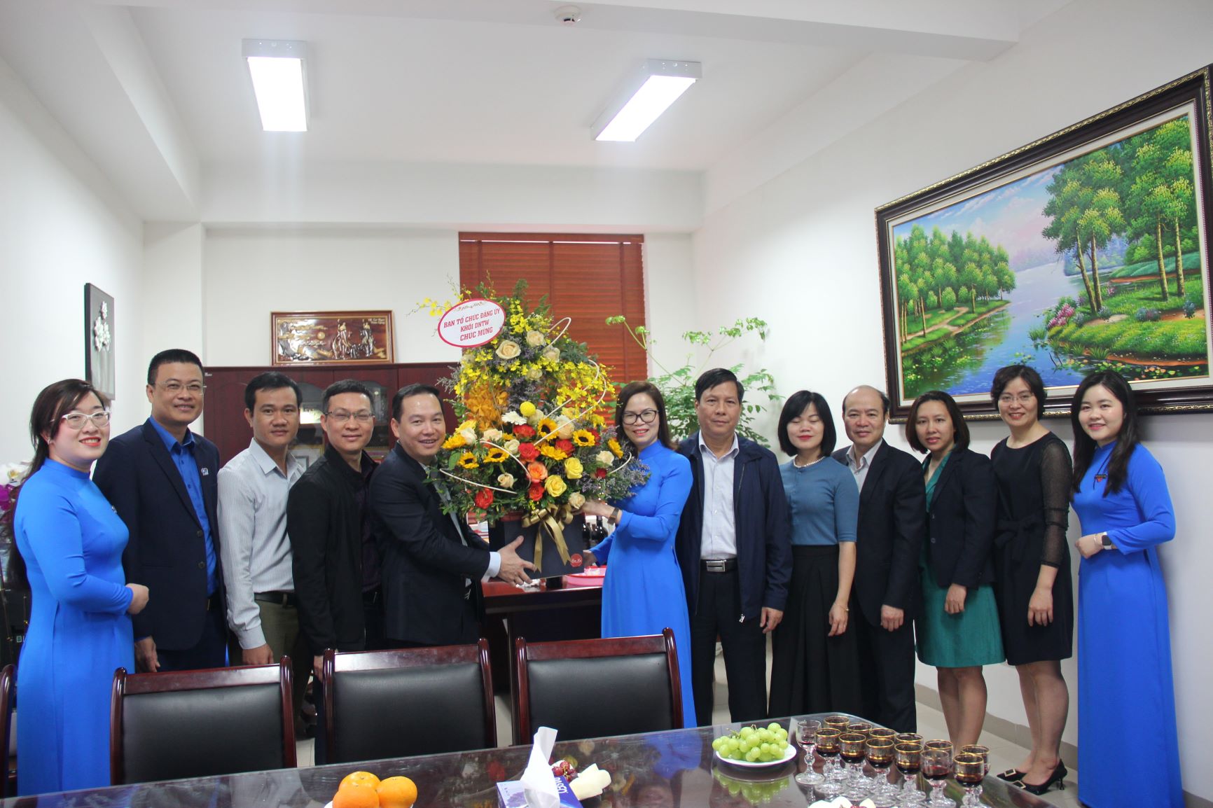 | Đồng chí Phạm Tấn Công, Phó Bí thư Thường trực Đảng ủy Khối; đồng chí Hoàng Giang, Phó Bí thư Đảng ủy Khối cùng các đồng chí lãnh đạo các ban, đơn vị Đảng ủy Khối tặng hoa, chúc mừng Đoàn Thanh niên Khối. |