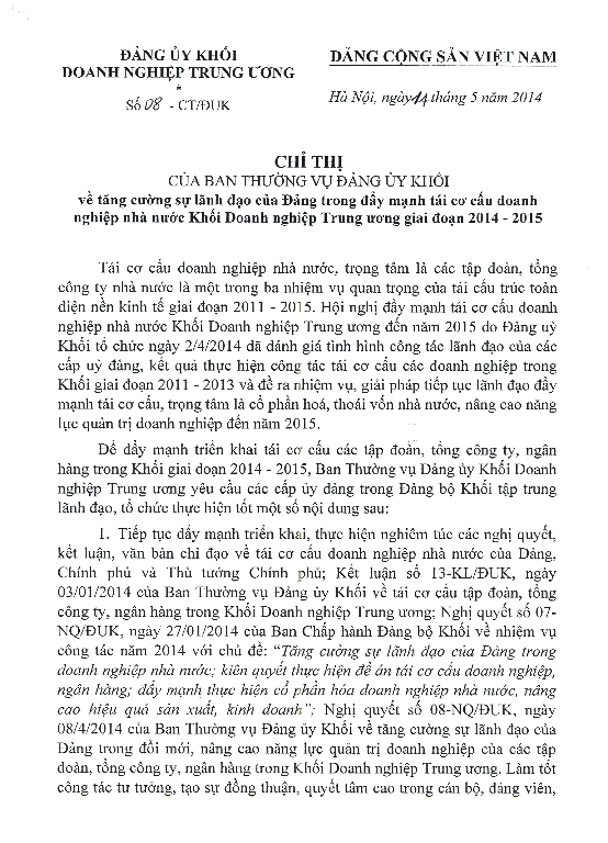 Ngày 14/5/2014, Ban Thường vụ Đảng ủy Khối đã ban hành Chỉ thị số 08 - CT/ĐUK về tăng cường sự lãnh đạo của Đảng trong đẩy mạnh tái cơ cấu doanh nghiệp nhà nước Khối Doanh nghiệp Trung ương giai đoạn 2014 - 2015. Toàn văn Chỉ thị như sau: