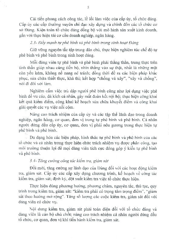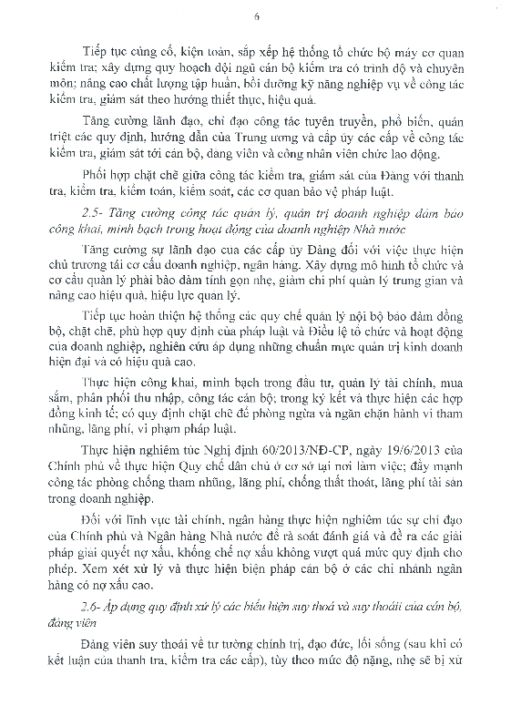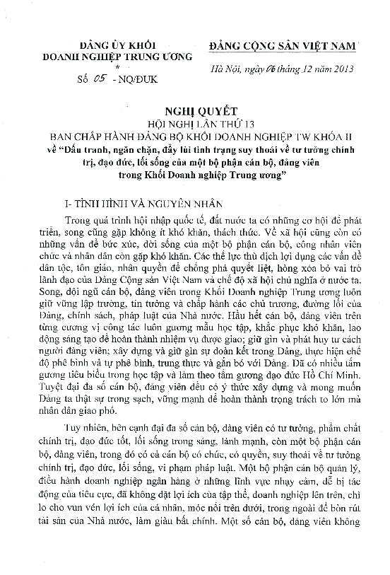 Ngày 06/12/2013, Ban Chấp hành Đảng bộ Khối đã ban hành Nghị quyết số 05 - NQ/ĐUK về "Đấu tranh, ngăn chặn, đẩy lùi tình trạng suy thoái về tư tưởng chính trị, đạo đức, lối sống của một bộ phận cán bộ, đảng viên trong Khối Doanh nghiệp Trung ương". Toàn văn Nghị quyết như sau:
