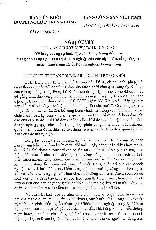 Ngày 08/04/2014, Ban Thường vụ Đảng ủy Khối đã ban hành Nghị quyết số 08 - NQ/ĐUK Về tăng cường sự lãnh đạo của Đảng trong đổi mới, nâng cao năng lực quản trị doanh nghiệp của các tập đoàn, tổng công ty, ngân hàng trong Khối Doanh nghiệp Trung ương. Toàn văn Nghị quyết như sau: