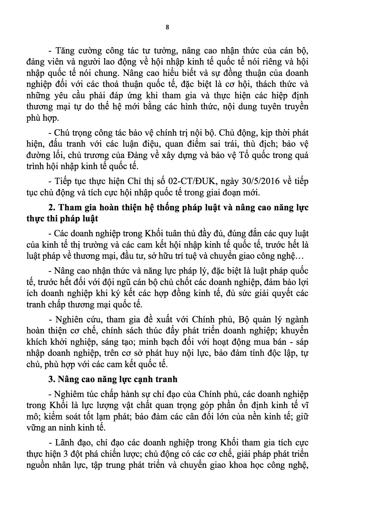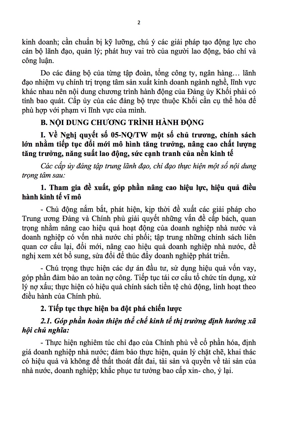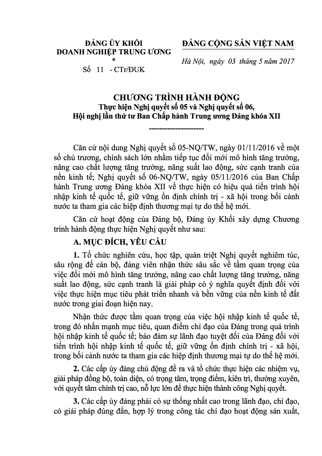 Đảng ủy Khối Doanh nghiệp Trung ương xây dựng Chương trình hành động thực hiện Nghị quyết Hội nghị lần thứ tư Ban Chấp hành Trung ương khóa XII về một số chủ trương, chính sách lớn nhằm tiếp tục đổi mới mô hình tăng trưởng, nâng cao chất lượng tăng trưởng, năng suất lao động, sức cạnh tranh của nền kinh tế và về thực hiện có hiệu quả tiến trình hội nhập kinh tế quốc tế, giữ vững ổn định chính trị - xã hội trong bối cảnh nước ta tham gia các hiệp định thương mại tự do thế hệ mới.