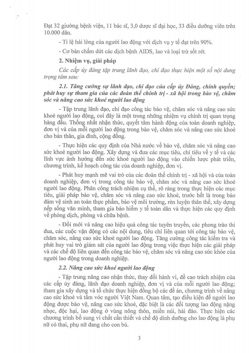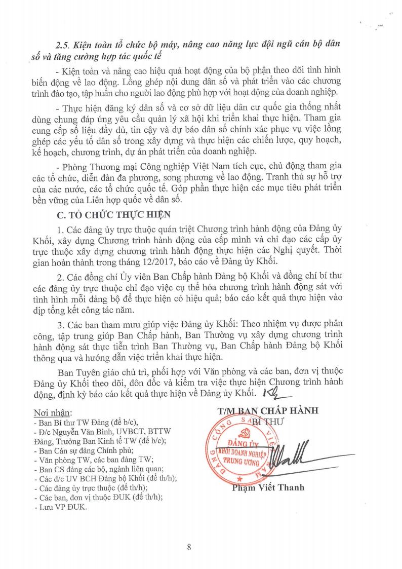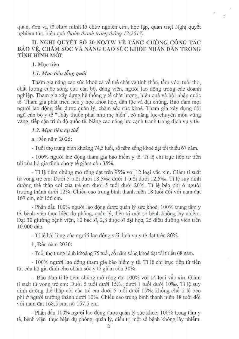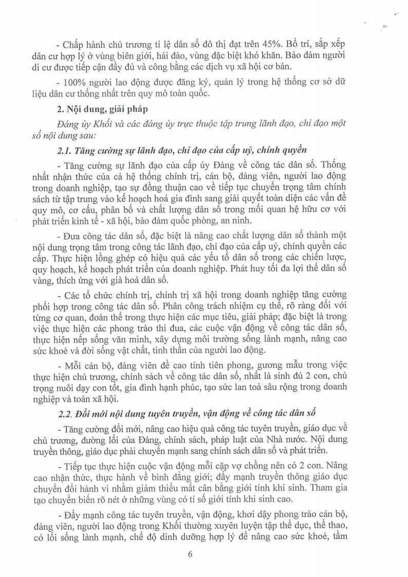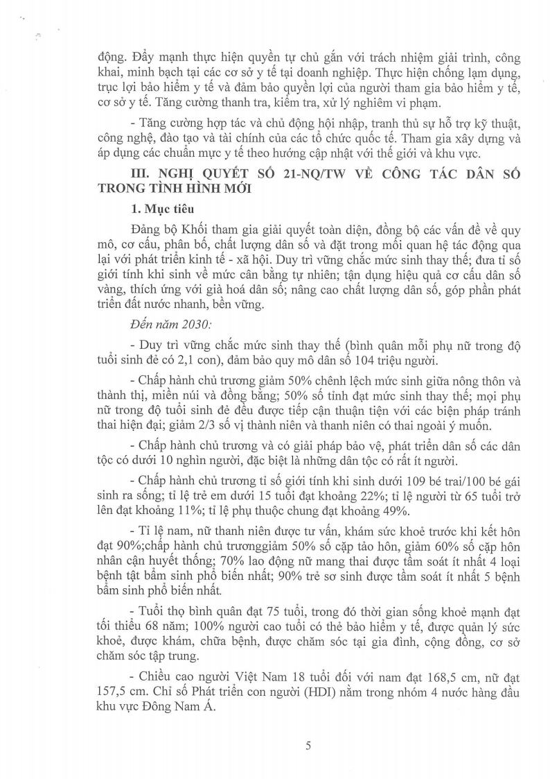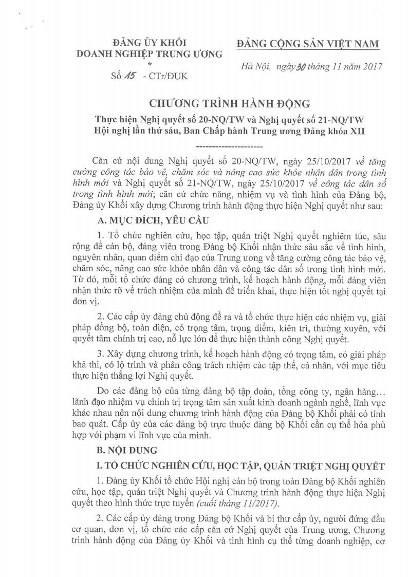 Ngày 30/11/2017, Đảng ủy Khối đã ban hành Chương trình hành động số 15 – CTr/ĐUK thực hiện Nghị quyết số 20-NQ/TW “về tăng cường công tác bảo vệ, chăm sóc và nâng cao sức khoẻ nhân dân trong tình hình mới” và Nghị quyết số 21-NQ/TW “về công tác dân số trong tình hình mới”.