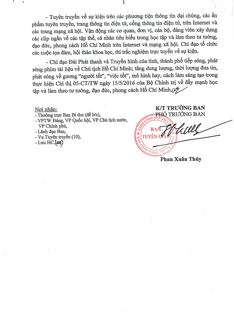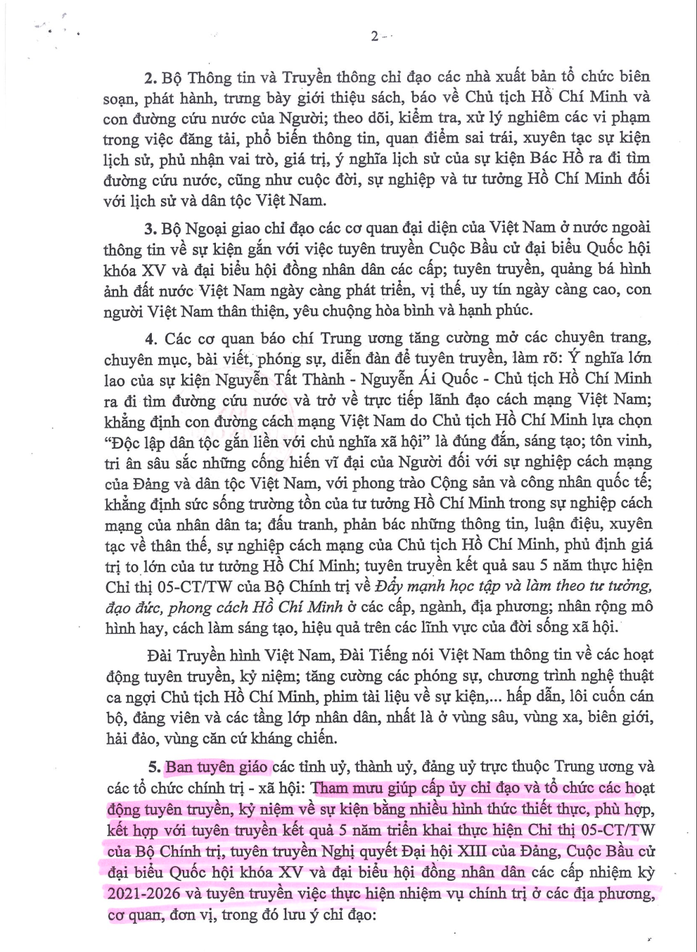 Ngày 19/5/2021, Ban Tuyên giáo Trung ương đã ban hành Công văn số 557-CV/BTGTW về việc đẩy mạnh tuyên truyền, kỷ niệm 110 năm Ngày Bác Hồ ra đi tìm đường cứu nước.