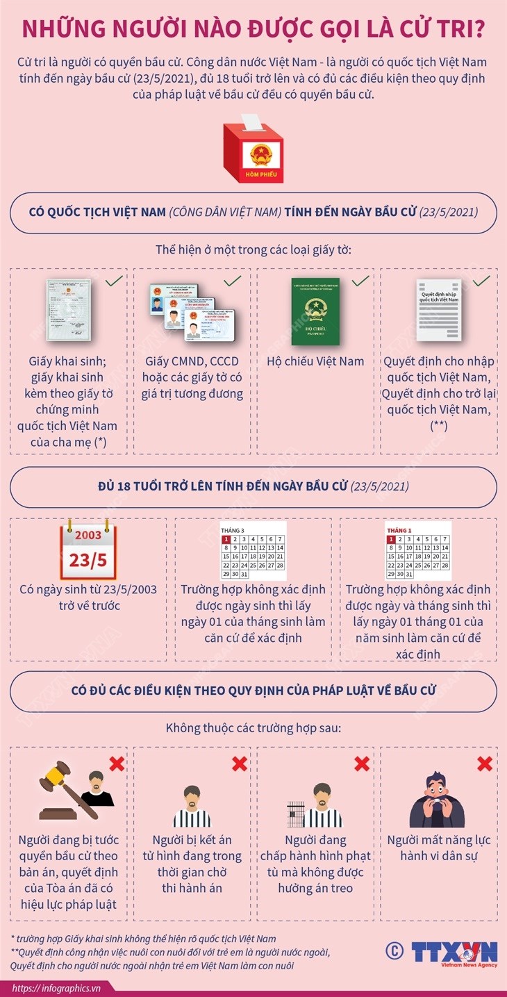 Cử tri là người có quyền bầu cử. Công dân nước Việt Nam, có quốc tịch Việt Nam tính đến ngày bầu cử (23/5/2021), đủ 18 tuổi trở lên, có đủ điều kiện theo pháp luật về bầu cử đều có quyền bầu cử.