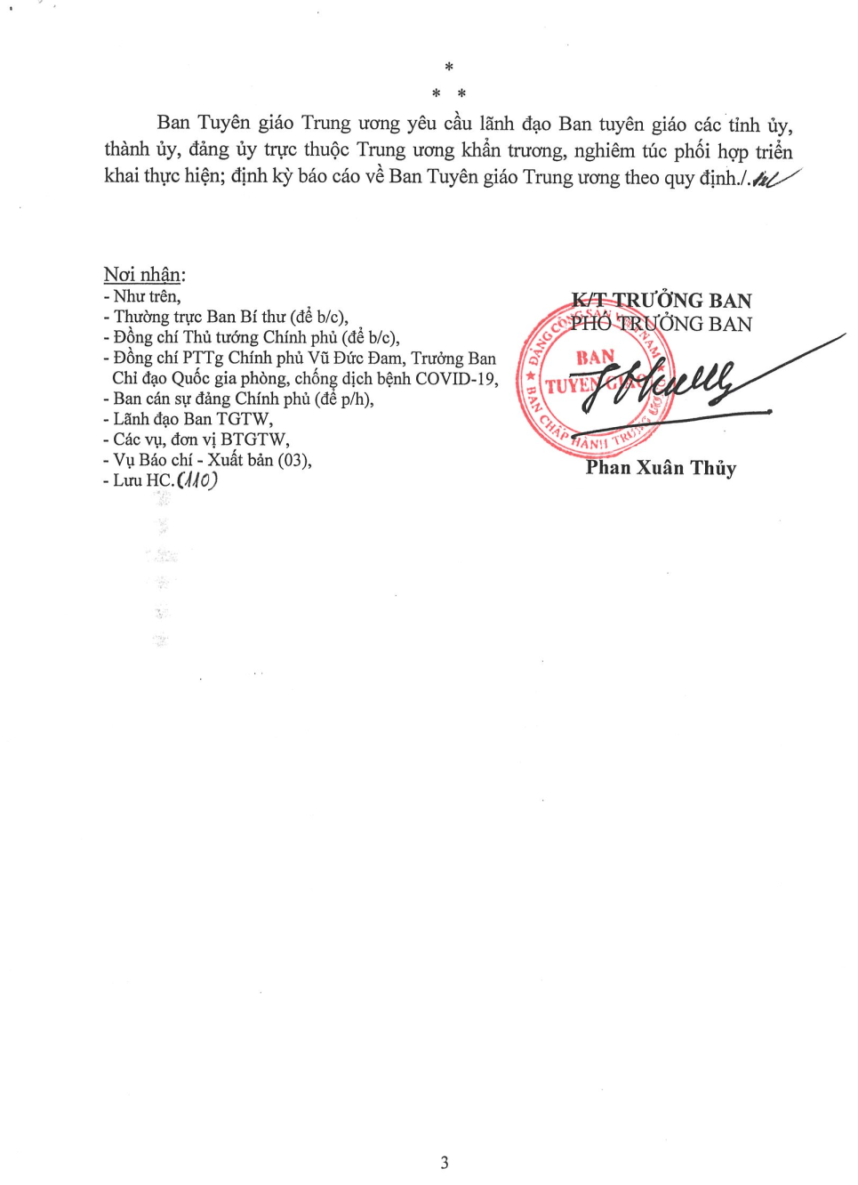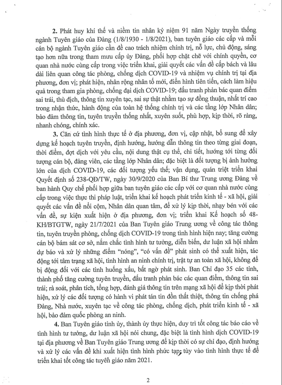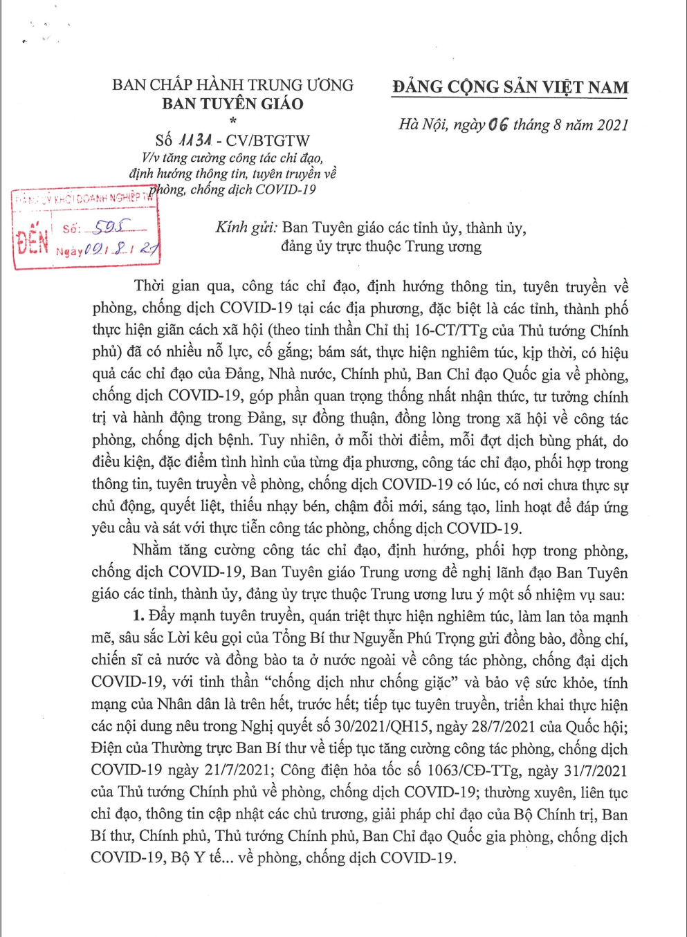 Ngày 06/8/2021, Ban Tuyên giáo Trung ương ban hành Công văn số 1131-CV/BTGTW về việc tăng cường công tác chỉ đạo, định hướng thông tin, tuyên truyền về phòng, chống dịch Covid-19. Tạp chí điện tử Đảng ủy Khối Doanh nghiệp Trung ương đăng tải toàn văn nội dung như sau: