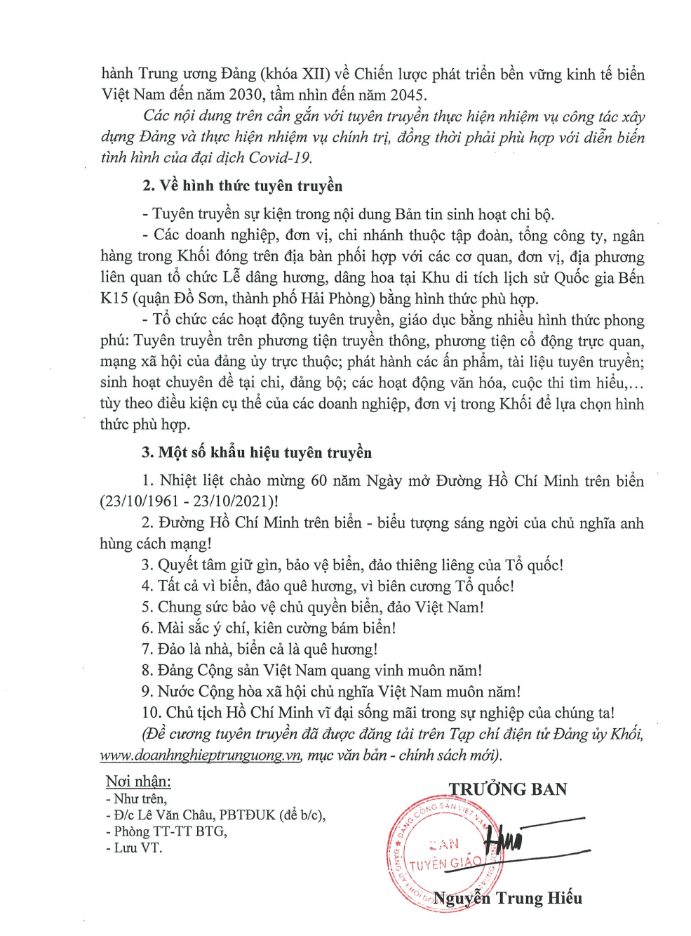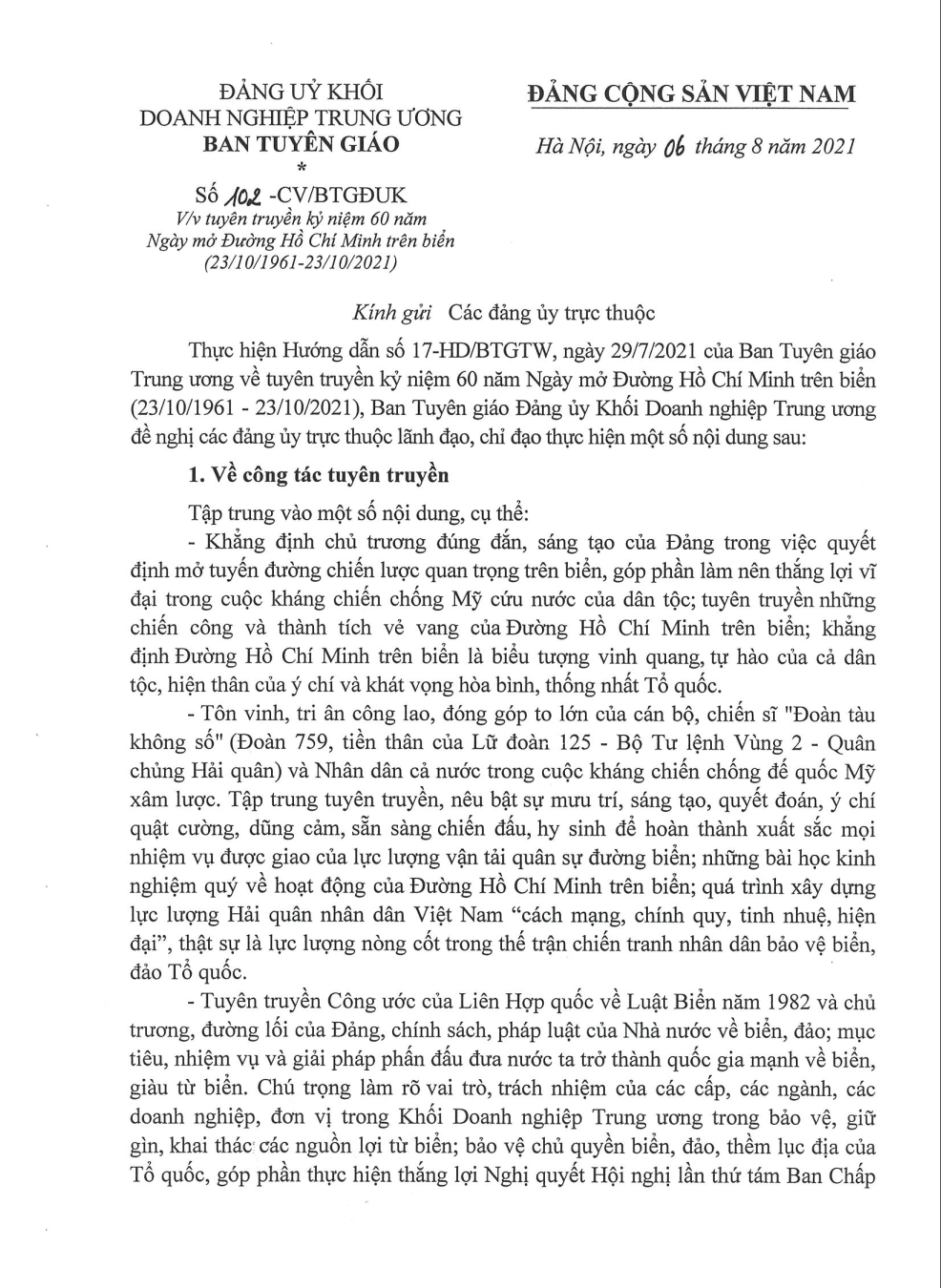 Ngày 06/8/2021, Ban Tuyên giáo Đảng ủy Khối Doanh nghiệp Trung ương đã ban hành Công văn số 102-CV/BTGĐUK, về việc tuyên truyền kỷ niệm 60 năm Ngày mở Đường Hồ Chí Minh trên biển (23/10/1961-23/10/2021).