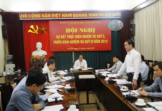 Thay mặt thường trực Đảng ủy, đồng chí Nguyễn Văn Quý, Phó Bí thư đảng ủy, đã trình bày Báo cáo Sơ kết công tác quý I, nêu rõ những kết quả đạt được trong công tác lãnh đạo thực hiện nhiệm vụ chính trị của Đảng ủy trên các mặt sản xuất kinh doanh, đầu tư xây dựng, công tác xây dựng Đảng. Theo đó, quý I 2012, Đảng ủy, Hội đồng thành viên, Ban lãnh đạo Tập đoàn Hóa chất Việt Nam đã nghiêm túc thực hiện các chủ trương, chính sách, chỉ thị, Nghị quyết của Đảng, Chính phủ; bám sát sự chỉ đạo, lãnh đạo của Đảng ủy khối DNTW, Bộ Công Thương, Bộ Tài chính đã lãnh đạo, chỉ đạo các đơn vị trong Tập đoàn thực hiện cơ bản hoàn thành nhiệm vụ sản xuất kinh doanh, đảm bảo việc làm và thu nhập cho người lao đông; làm tốt công tác xây dựng Đảng; cán bộ, đảng viên, công nhân viên trong Tập đoàn có sự đoàn kết, nhất trí cao, tin tưởng vào sự lãnh đạo của Đảng. Công tác điều hành SXKD đã bám sát các mục tiêu đề ra với phương châm điều hành linh hoạt theo diễn biến của kinh tế vĩ mô. Thực hiện chỉ đạo của Tập đoàn về tiết giảm chi phí trong quản lý và SXKD, các doanh nghiệp trong Tập đoàn đã nghiêm chỉnh đăng ký thực hiện, kết quả bước đầu các đơn vị đăng ký tiết giảm là 230 tỷ.