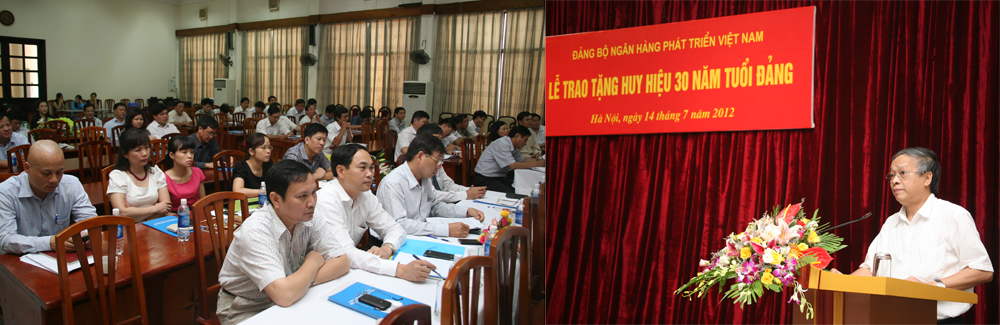 Sáng ngày 14/7/2012, Ban Chấp hành Đảng bộ Ngân hàng Phát triển Việt Nam (NHPT) đã tổ chức Hội nghị Ban Chấp hành kỳ họp thứ XI (mở rộng) sơ kết công tác 6 tháng đầu năm, triển khai nhiệm vụ công tác 6 tháng cuối năm 2012 và trao tặng Huy hiệu 30 Năm tuổi Đảng cho các đảng viên của Đảng bộ. Đồng chí Nguyễn Quang Dũng, Bí thư Đảng ủy -Tổng Giám đốc NHPT chủ trì Hội nghị.