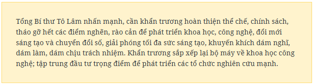 Cần ưu tiên bố trí ngân sách cho khoa học công nghệ xứng tầm trong nghiên cứu-phát triển, lập các quỹ khoa học và công nghệ, khuyến khích hình thành các quỹ đầu tư mạo hiểm, quỹ thiên thần, quỹ khởi nghiệp, quỹ đổi mới sáng tạo, v.v… Nhanh chóng phát triển nguồn nhân lực chất lượng cao bằng cơ chế thu hút nhân tài nói chung, đặc biệt là nhân tài khoa học, công nghệ, nhân tài người Việt Nam ở nước ngoài và chuyên gia quốc tế, với các chính sách hấp dẫn về quốc tịch, thu nhập, nhà ở và môi trường làm việc. Tăng cường đầu tư cơ sở hạ tầng công nghệ, bao gồm công nghệ số, đặc biệt, cần chuẩn bị hạ tầng năng lượng cho 5-10 năm tới, với trọng tâm là năng lượng sạch, bảo đảm đủ năng lượng cho phát triển bằng hành động cụ thể; tối ưu hóa và nâng cấp hạ tầng số.