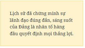Lịch sử đã chứng minh sự lãnh đạo đúng đắn, sáng suốt của Ðảng là nhân tố hàng đầu quyết định mọi thắng lợi. Trải qua những chặng đường cách mạng gian khổ, Ðảng ta được tôi luyện và ngày càng trưởng thành, không ngừng đổi mới tư duy, phương thức lãnh đạo, tăng cường sức mạnh chiến đấu trong mọi hoàn cảnh, xứng đáng với sứ mệnh lãnh đạo cách mạng, với sự tin tưởng và kỳ vọng của nhân dân. Ôn lại lịch sử 95 năm xây dựng, chiến đấu và trưởng thành của Ðảng, tự hào về Ðảng quang vinh, chúng ta biết ơn vô hạn công lao to lớn của Chủ tịch Hồ Chí Minh, lãnh tụ thiên tài, người thầy vĩ đại của cách mạng Việt Nam, Người đã sáng lập, lãnh đạo và rèn luyện Ðảng ta. Chúng ta mãi mãi khắc ghi sự cống hiến, hy sinh của các vị lãnh đạo tiền bối, các anh hùng, liệt sĩ, những người con ưu tú của dân tộc, đã kiên cường chiến đấu, đóng góp to lớn vào sự nghiệp cách mạng của Ðảng, của dân tộc.
